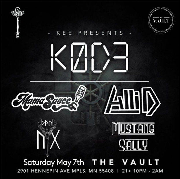 K0D3 Venue The Vault 2901 Hennepin Ave S Minneapolis, MN 55408 United States TimeSat, May 7 2022, 10pm - Sun, May 8 2022, 2am Promoter Kee Price$10.00 Artists DJ MamaSauce DJ Alli D Dani Nyx Mustang Sally Genres House Deep House Funk Age Limit 21+ Websitekeepresents.com